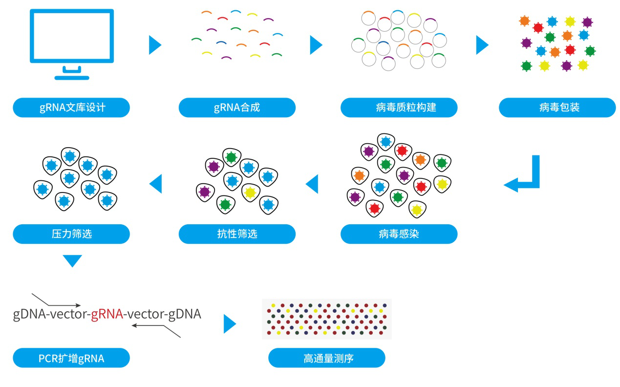 CRlSPR/Cas9 gRNA文库筛选流程分为五步,即gRNA文库选择、gRNA文库扩增、gRNA文库慢病毒包装、gRNA文库筛选、PCR扩增和NGS测序