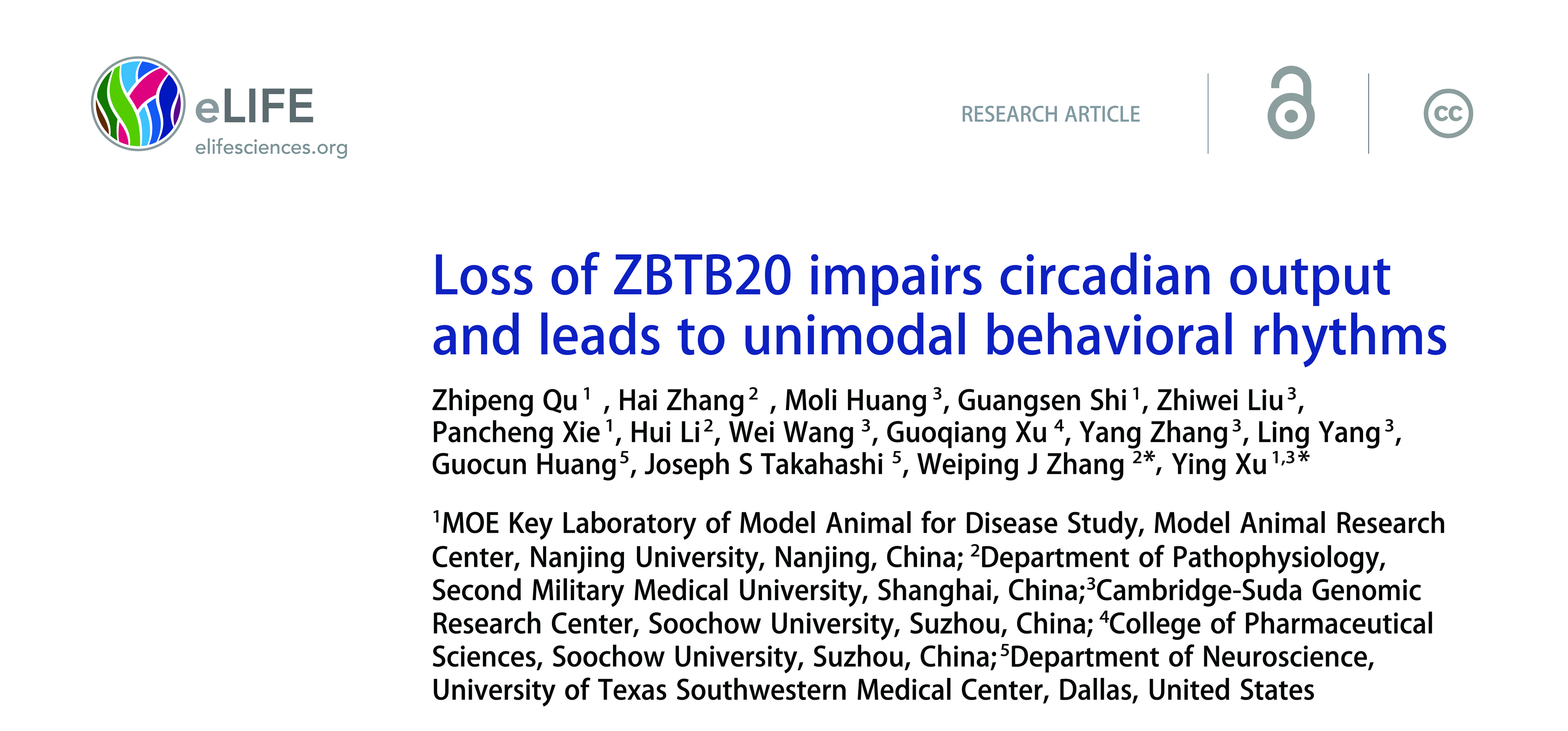近日,南京大学模式动物研究所的徐璎课题组与第二军医大学章卫平课题组共同合作在国际生物和医学领域权威杂志《eLife》(IF=8.303)上发表论文,题为“Loss of ZBTB20 impairs circadian output and leads to unimodal behavioral rhythms”,发现锌指蛋白ZBTB20是调控小鼠早晚活动峰的关键分子。文中使用的腺相关病毒(AAV)由j9九游会生物包装提供。