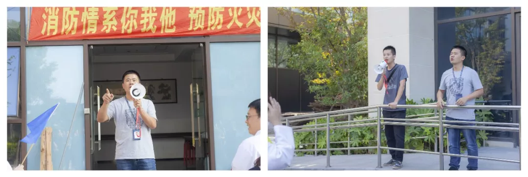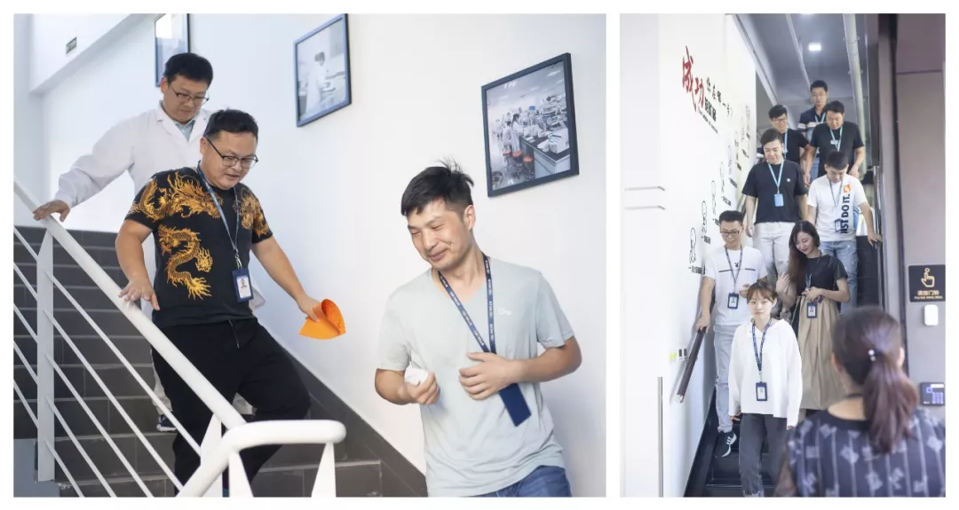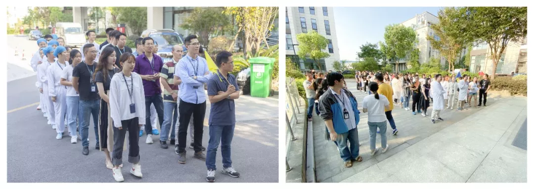 演习开始,警铃响起后,全体员工有序从办公室及实验室撤离