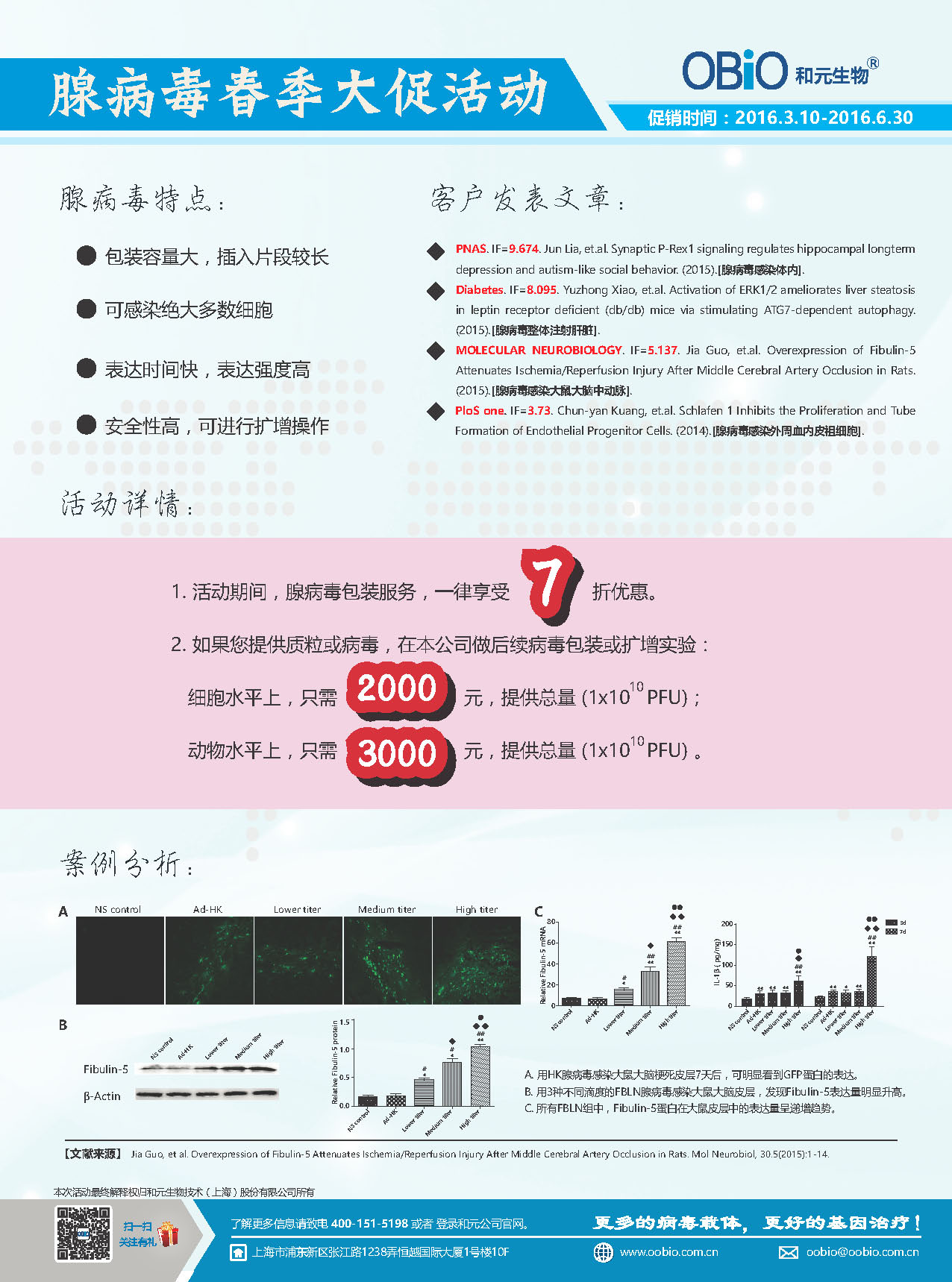 2016.03.10—2016.06.30,j9九游会生物正在举行腺病毒春季大促活动:1. 活动期间,腺病毒包装服务,一律享受7折;2. 如果您提供质粒或病毒,在本公司做后续病毒包装或扩增实验,细胞水平上,只需2000元(提供总量1*1010PFU),在动物水平上,只需3000元(提供总量1*1010PFU)。详情请见下面单页: