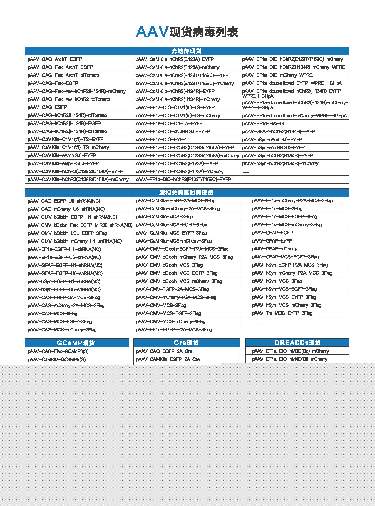AAV现货包括光遗传、DREADDs、GCaMP、Cre和对照病毒现货,种类丰富,价格合理,欢迎订购!