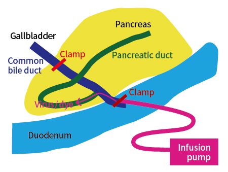 过去,为了感染胰腺,我们常用AAV8病毒载体,但是其感染过程非常复杂,需要用微夹钳夹住胆胰管的近肝端和近十二指肠端,然后用泵将病毒注入胆管感染胰腺。