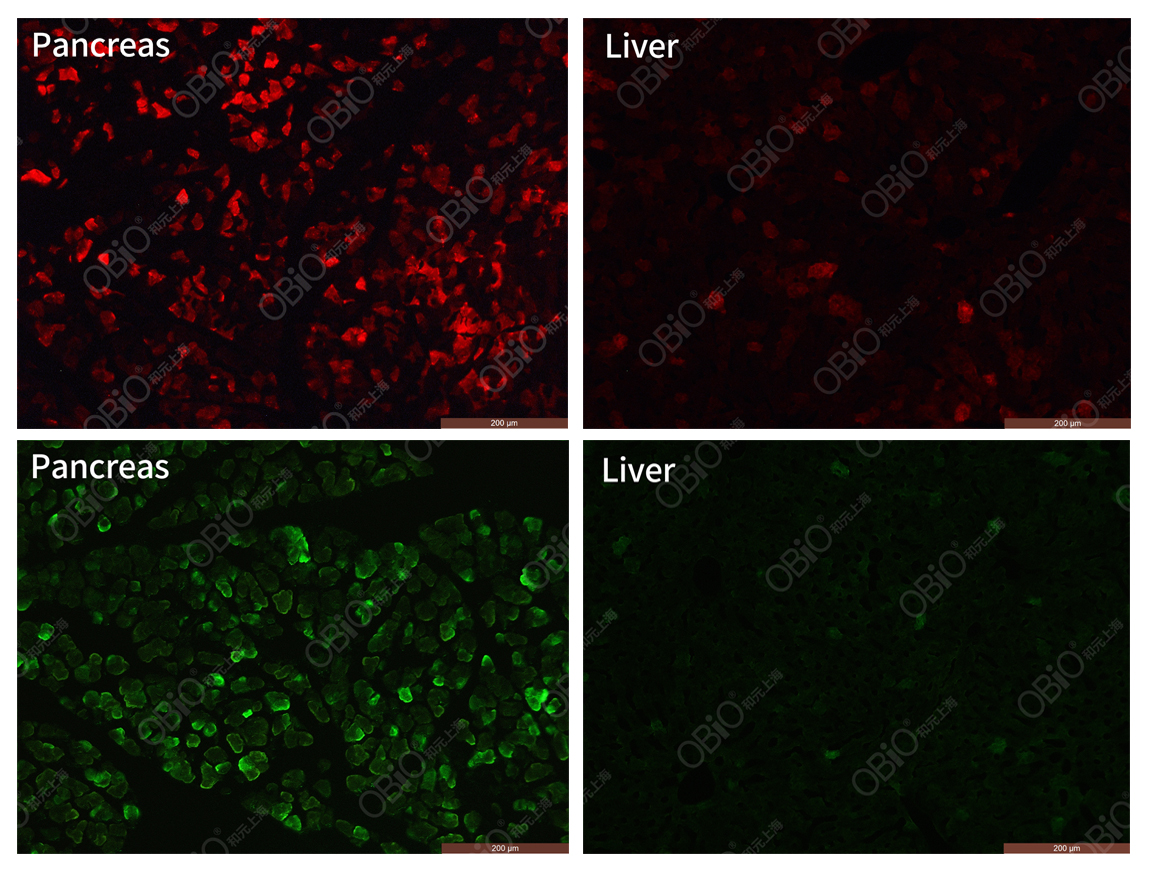 现在,这些难题都能够被攻破了,j9九游会生物 根据国内外专家的研究指导,结合自身病毒载体改造的经验,全新研发了新型胰腺感染的AAV病毒载体AAV-PAN。我们只需在腹腔注射少量AAV-PAN病毒载体,即可很好地感染胰腺,结果如下图: