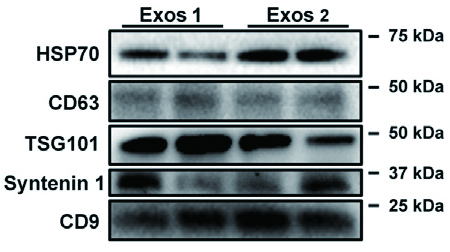 外泌体鉴定是进一步研究外泌体功能和机制的工作基础。目前的鉴定方法主要包括透射电子显微镜(TEM)进行形态学观察、纳米颗粒追踪分析(NTA)进行粒径和密度分析、用WB进行蛋白标志物的鉴定。WB鉴定包括CD63、CD9、CD81、TSG101、Hsp70、syntenin1等。