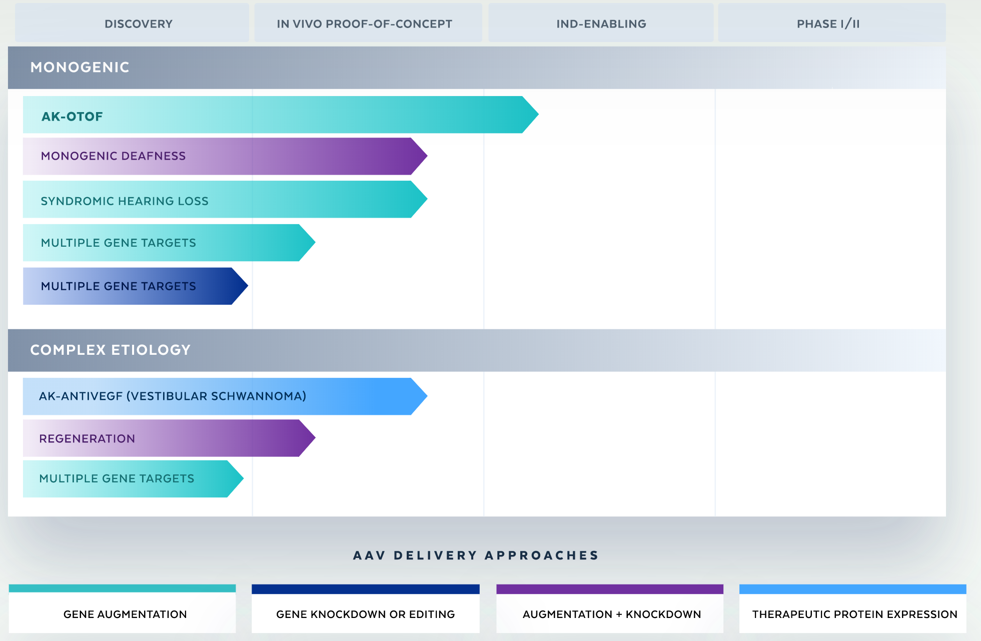 值得注意的是,Akouos并不是唯一一家开发遗传性听力损失基因治疗的公司。Decibel、Otonomy、Frequency等公司也在开发相关治疗手段:
