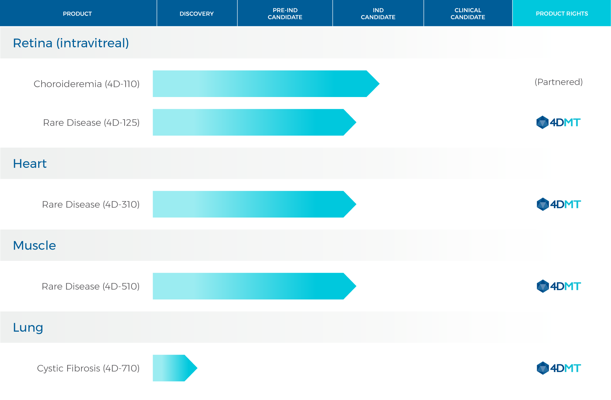 此外,这笔资金还将帮助支持4DMT的临床前产品研发管线和平台,包括4D-710, 4DMT旗下针对囊性纤维化肺部疾病的气雾剂基因治疗疗法,以及在神经肌肉疾病和眼科领域的基因治疗候选产品,4DMT开发药物的适应症同时面向罕见病和大型市场的研发。