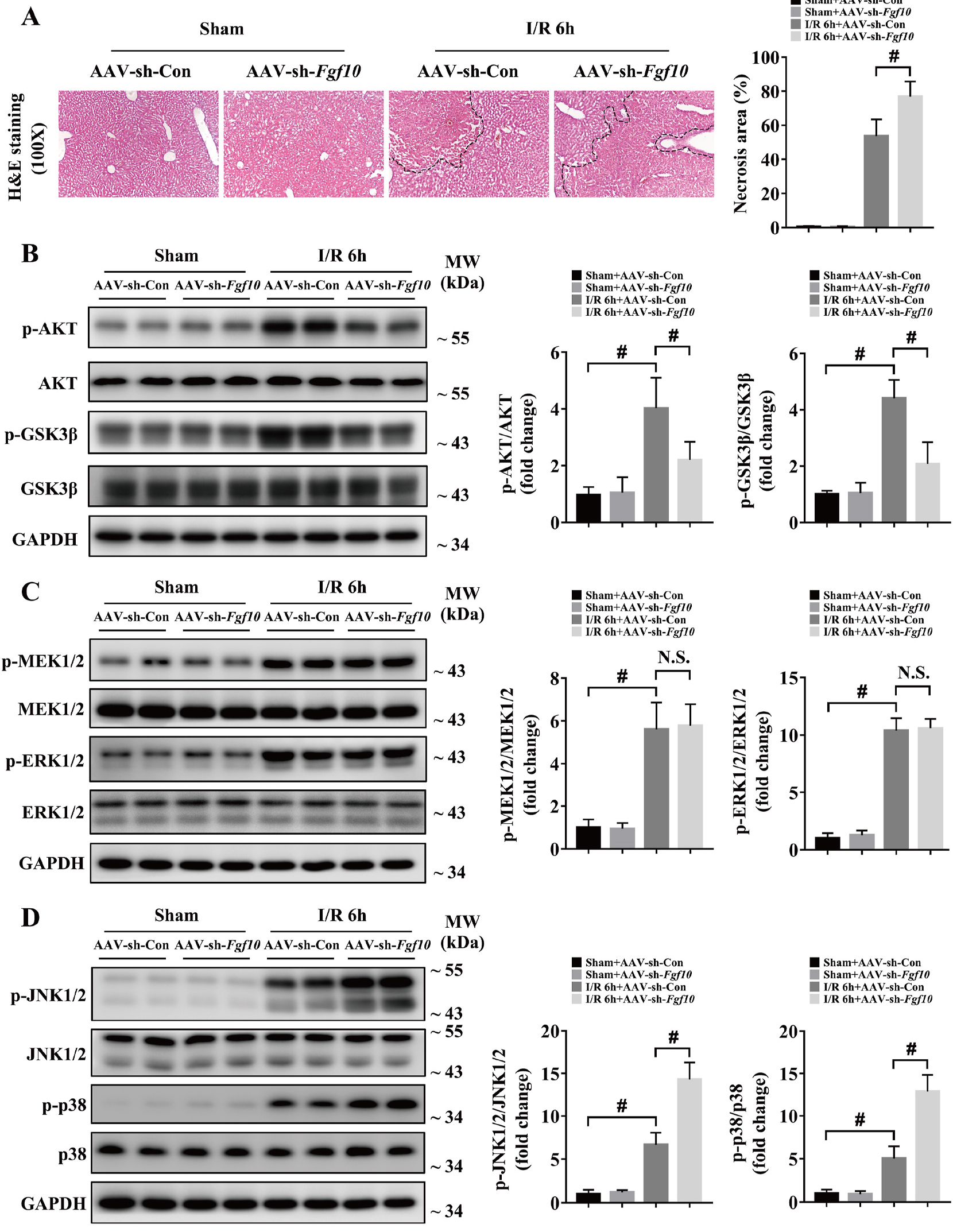 为了确定FGF10在肝脏IRI中的作用,研究人员利用AAV病毒载体对肝脏中的FGF10进行基因操作。研究发现,肝脏IRI后6h肝脏坏死严重,肝脏中过表达FGF10在肝脏IRI中起到保护作用,减少肝脏的坏死面积,敲低FGF10表达加重肝脏IRI后的肝脏坏死面积(图3A&图4A)。