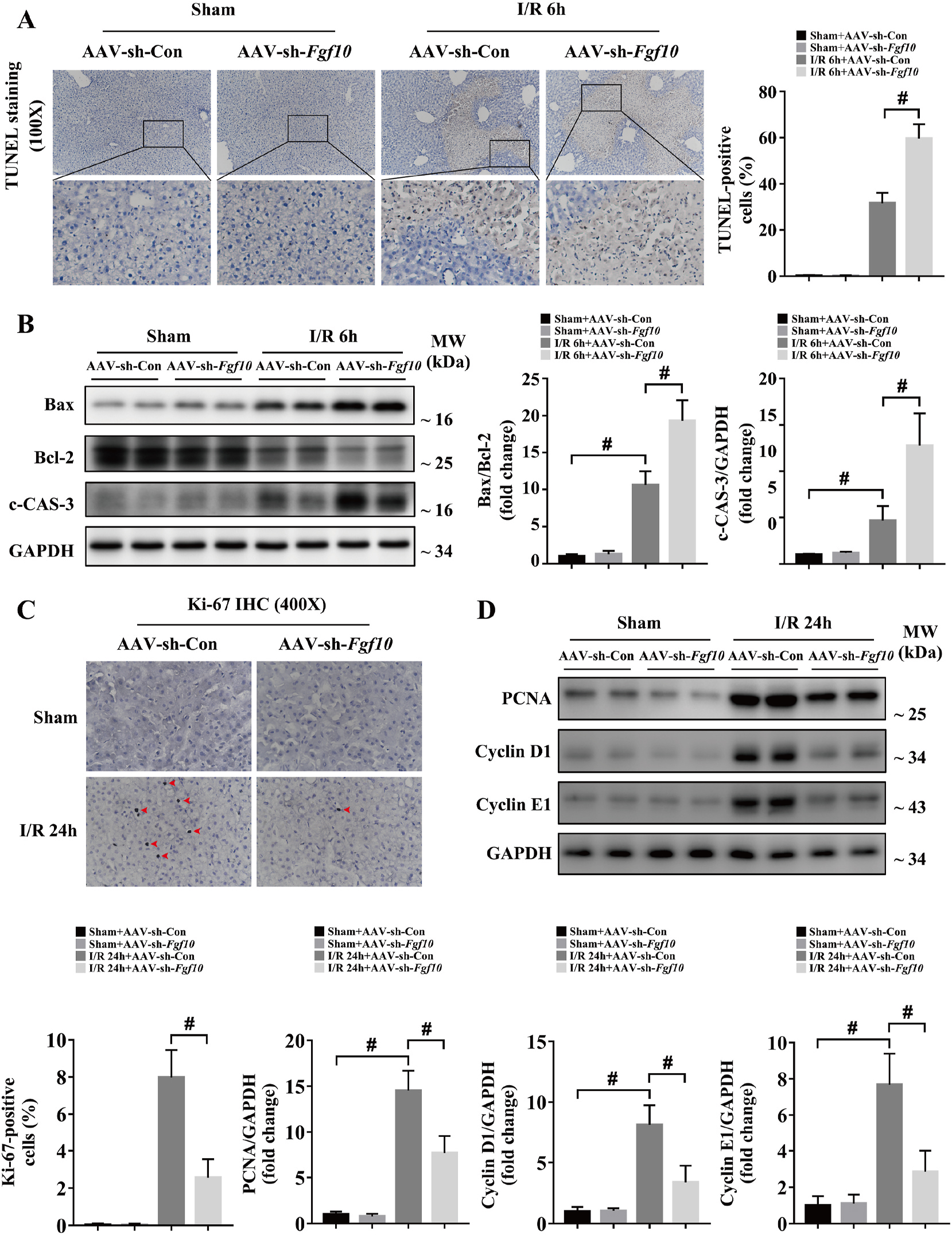 细胞凋亡是造成肝脏IRI损伤的重要原因,因此研究者对FGF10在肝脏IRI细胞凋亡与增殖进行研究。研究发现,肝脏IRI术后6h肝脏细胞凋亡显著增多,并且c-CAS-3与促凋亡基因Bax/抑制凋亡基因Bcl-2显著增加;肝脏IRI恢复期,肝细胞增殖增加;FGF10过表达抑制肝细胞凋亡、促进肝细胞增殖(图5);干扰FGF10表达则与之相反(图6)。因此,FGF10在肝脏IRI后细胞增殖调控中发挥重要作用。