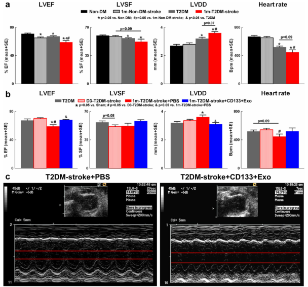 Fig.2 卒中和T2DM能诱导小鼠的心功能障碍,而CD133+Exo处理能改善T2DM卒中小鼠的心功能