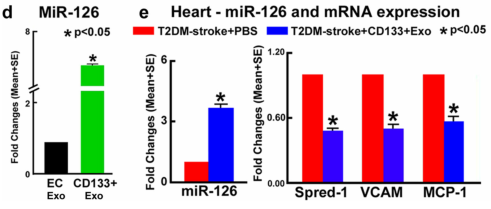 Fig.6d-e CD133+Exo处理可显著提高T2DM卒中小鼠的miR-126水平和降低其靶基因表达