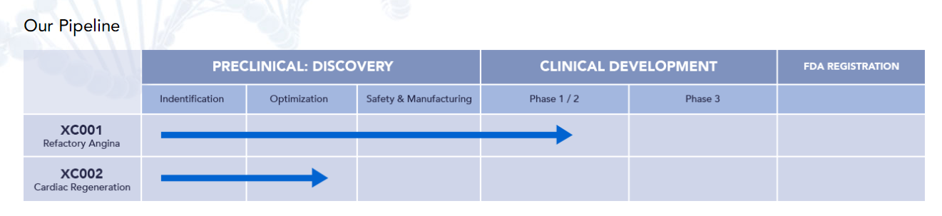 Xylocor Therapeutics是一家致力于利用基因疗法治疗晚期冠状动脉疾病的生物医药公司, XC001是该公司目前主要在研基因疗法管线,用于治疗难治性心绞痛,该病患者心肌无法获得足够的氧气来支持其工作,通常是冠状动脉疾病导致的,其中主要冠状动脉中的动脉粥样硬化狭窄,流向心肌的血流不足导致经常出现的胸痛。该产品旨在心脏中特异性表达能够促进血管增生的血管内皮生长因子(VEGF),从而促进心脏的血管生成,目前处于1/2期临床试验中。