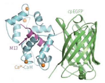 2、基因编码钙离子指示剂:这些指示剂是来自于绿色荧光蛋白(GFP)及其变异体(例如循环排列GFP、YFP、CFP)的荧光蛋白质,与钙调蛋白(CaM)和肌球蛋白轻链激酶M13域融合。现在使用较广泛的基因编码钙离子指示剂有:GCaMP、Pericams、Cameleons、TN-XXL和Twitch,其中GCaMP6由于它有着超强的敏感度,现在被广泛应用于活体钙成像研究,其发出荧光的原理在于钙离子浓度上升导致M13与CaM结合,从而改变cpEGFP的构象,将其从无荧光的状态变为绿色荧光