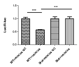 材料:质粒pMIR-REPORT Luciferase基因3'UTR(Wt);pMIR-REPORT Luciferase-基因3'UTR(Mut);pRL-CMV(H321,Promega);293T细胞株
