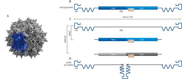 现在研究中常用的rAAV就是利用AAV2型基因组与不同的衣壳蛋白结合产生的混合体病毒载体,一般标记为rAAV2/N (N为不同的衣壳血清型)。重组的病毒具有AAV2型的稳定表达和基因整合能力,同时获得了不同血清型的组织感染嗜亲性(不同血清型衣壳表面的特定结构位点决定了各自受体的特异性),表现出一定的器官靶向特异性。