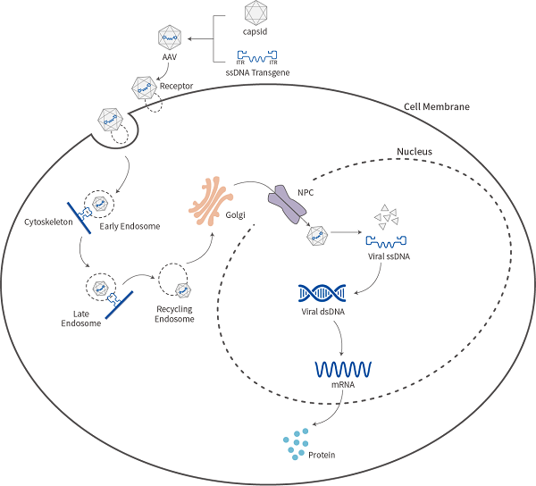 纯化后的AAV病毒载体可以用于侵染细胞,侵染细胞时,AAV与细胞表面特异性受体结合,激活胞内信号通路,进而触发AAV通过受体介导的内吞作用进入细胞,在核内体、高尔基体等细胞器的协助下进入细胞核,随后病毒裂解,其单链DNA需复制成为双链DNA后表达目的基因。