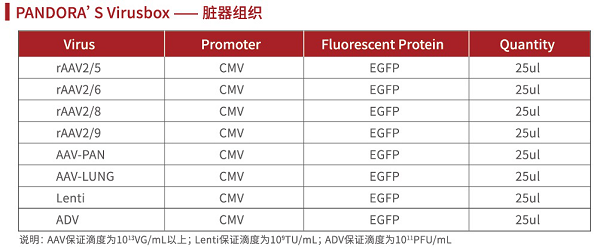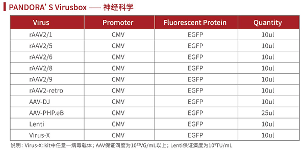 小建议:如您不确定选择哪种血清型,可尝试使用j9九游会生物Pandora’s Virus (AAV多种血清型)进行预实验,通过比较不同血清型对目标组织的感染效果,摸索最佳实验条件(注射方法、注射位点、病毒用量等),以便得到更理想的实验结果。