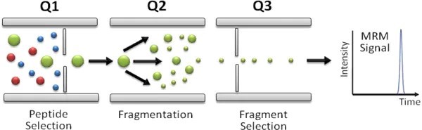 使用平台主要是三重四级杆质谱仪,通过多反应监测技术(MRM)进行检测。代谢物进入质谱后,只有与给定质荷比一致的母离子能通过第一个四级杆并被检测,在第二个四级杆中目标离子发生碰撞产生子离子碎片,而只有与给定的质荷比一致的子离子能通过第三个四级杆并被检测到,最后检测到的母子离子对的质谱峰与标准曲线比对得到定量值。