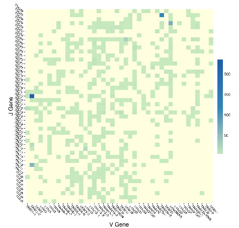 V-J paired直接反应出CDR3或免疫组库的变化,图中横坐标为V Gene,纵坐标为J Gene。颜色越深表示V-J paired丰度越高。