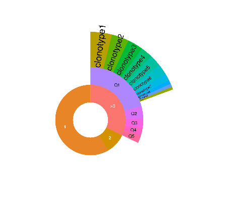 一个clonotype(克隆亚型)的定义为:一组唯一的CDR3核苷酸序列。Cell Ranger根据拼接得到的Consensus中的CDR3氨基酸序列进行Clonotype分型,其有效Barcode为该Clonotype的丰度。利用圈图展示免疫组库的top10 clonotype频率分布(clonality)。