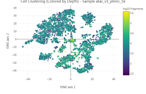 Cell Ranger ATAC 利用每个细胞的peaks 信息,运行cluster mode 对这些细胞进行分群。经tSNE 降维算法,得到细胞聚类的二维结果。