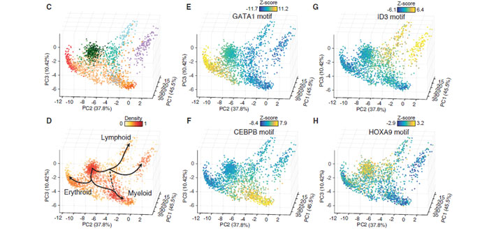 研究人员通过单细胞ATAC-Seq的研究策略,分析了10类已定义的人类造血系统分化细胞类型中染色质可接近性的数据,构建造血细胞分化中染色质可接近性状态的变化轨迹;并整合单细胞转录组数据,构建了转录因子动态调控轨迹。