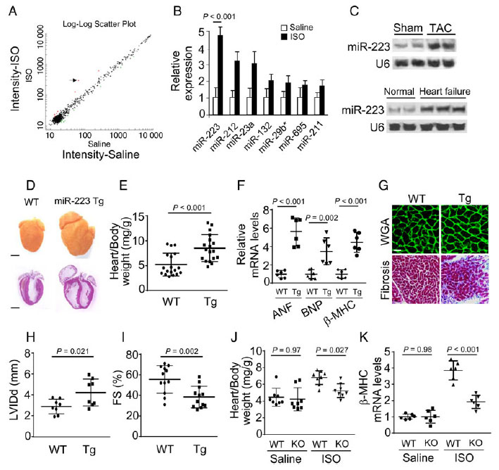 本研究中作者首先通过miRNA基因芯片分析、Northern blot、RT-PCR等技术手段发现,ISO处理14天后,miRNA-223的表达量显著上调,并且在患有心脏肥厚和心脏衰竭的人和小鼠心脏中miRNA-223的表达量也有明显的上调,初步得出结论:miRNA-223参与调控心肌肥厚和心脏衰竭。接下来作者利用miR-223过表达转基因小鼠以及miR-223基因敲除转基因小鼠进一步验证表型,结果发现miR-223过表达小鼠成年后出现明显的心肌肥厚和心脏衰竭症状,而miR-223基因敲除小鼠表型相反,进一步证明在活体内,miR-223可以诱导心肌肥厚和心脏衰竭。