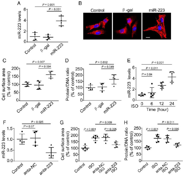 接下来作者进一步研究miR-223对心肌细胞的影响,结果发现miR-223过表达细胞中出现明显的心肌肥大反应,而miR-223敲除细胞中,ISO处理引起的心肌肥大反应明显被破坏,说明miR-223过表达会促进心肌肥厚,而miR-223基因敲除会阻断心肌肥厚。