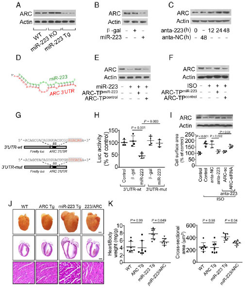 为了进一步研究miR-223调控心肌肥厚和心脏衰竭的分子机制,作者筛选了一些参与调控心肌肥厚的基因作为miR-223的靶标候选基因,然后通过western blot分析miR-223过表达和缺失突变体中上调以及下调的基因,结果发现miR-223可以显著抑制ARC的表达,而前人已经有研究报道ARC参与调控心肌肥厚和细胞凋亡,所以初步推断ARC可能是miR-223下游的靶标位点。