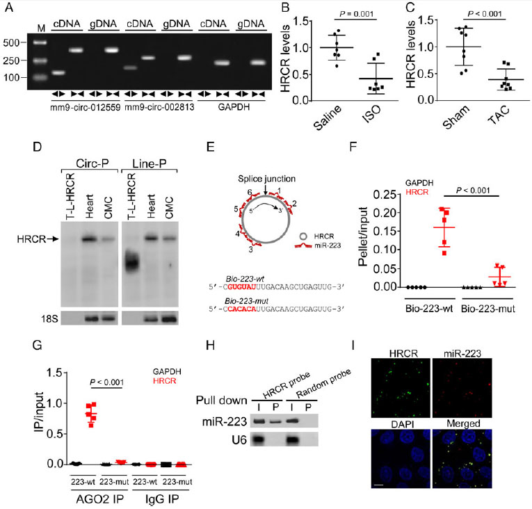 然后作者通过RNAhybrid分析发现HRCR包含6个CircRNA的靶标结合位点,初步表明HRCR可以和miR-223结合。接下来作者通过生物素标记,qRT-PCR,Northern bolt,pull down assay、荧光原位杂交(FISH)等技术手段,从正向以及反向两个角度分别验证HRCR和miR-223之间的互作关系,结果发现miR-223和HRCR在细胞质中存在共定位现象,HRCR可以直接结合到miR-223上。