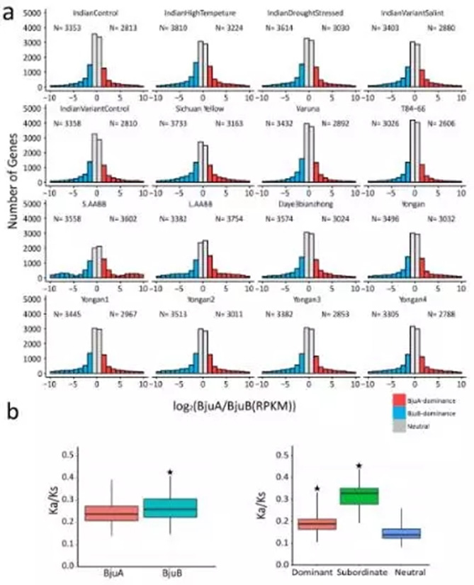由于芥菜基因组是异源四倍体,也就是说基因组中存在两套非常相似的亚基因组,那么在基因表达的过程中,位于两套亚基因组上的等位基因的表达模式是怎么样的呢,是一起表达,是相互抑制,还是一方占主导?