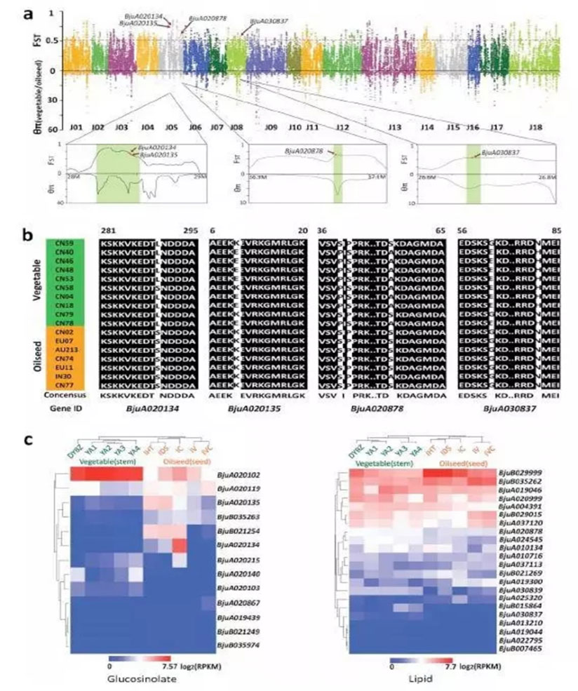 通过菜用和油用芥菜群体进行选择清除分析,发现dominance的基因被筛选出来的比例较高,同时结合转录组数据,这部分基因在油用和菜用两个群体中差异表达。同时通过上面的分析发现与硫苷,脂类代谢显著相关并且存在dominance的基因组,这些基因在油用菜用群体中有各自独特基因分型。