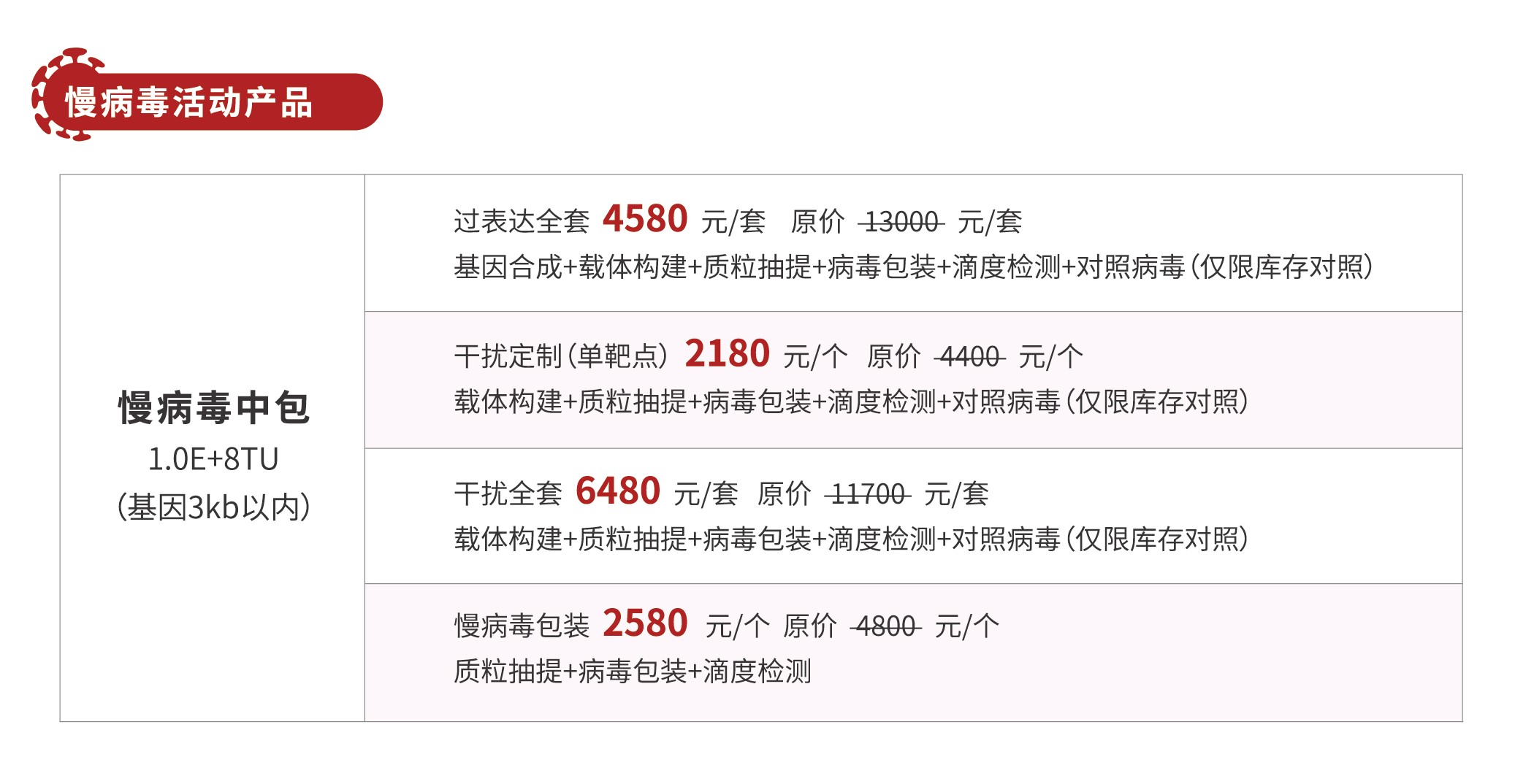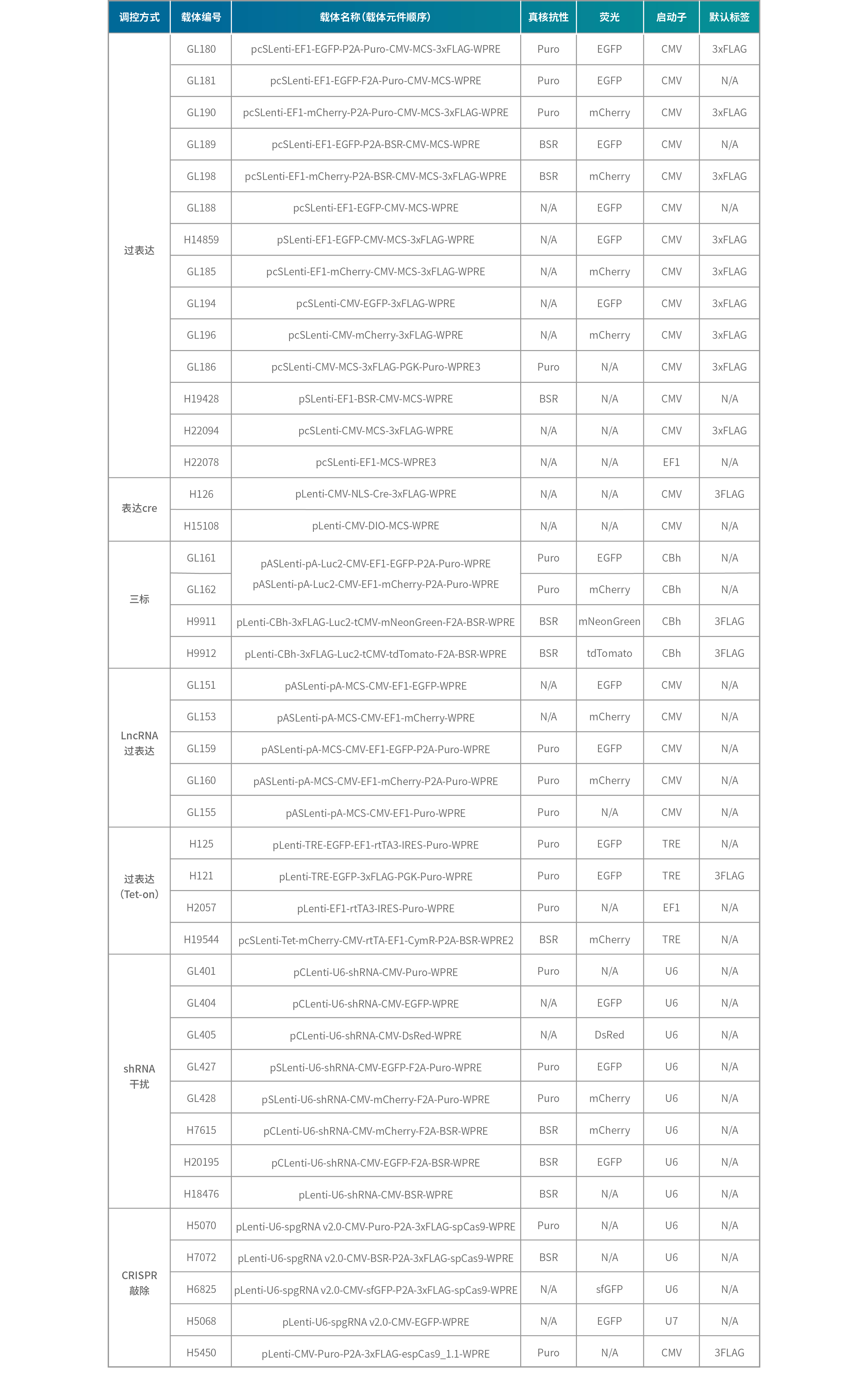 现货慢病毒:涵盖CRISPR/Cas9敲除或激活文库、自噬单标或双标、荧光素酶现货、Cre/Flp重组酶、光遗传学等工具类现货。