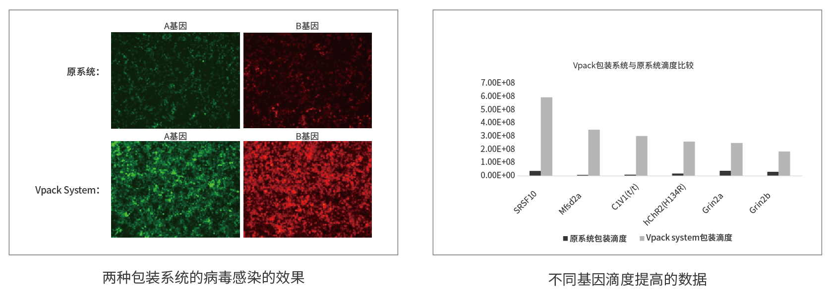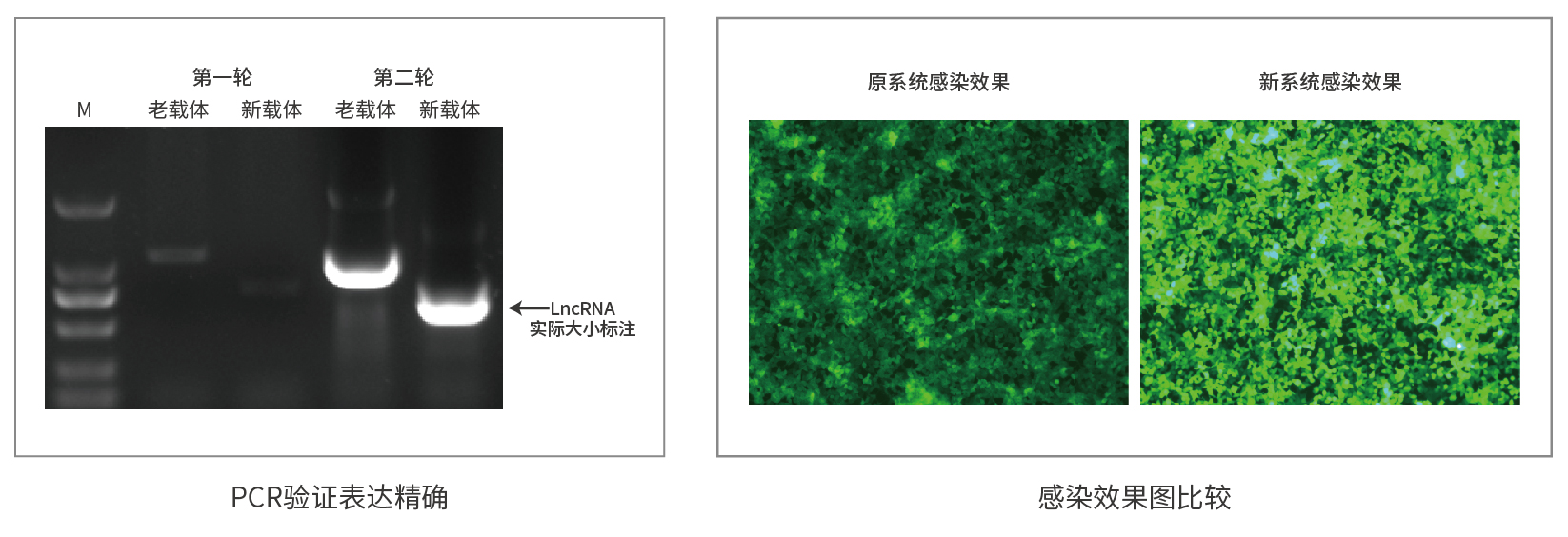 j9九游会生物新升级的慢病毒包装系统,全面解决病毒不出毒和滴度低的问题,针对编码基因或非编码基因均有效提高滴度,平均滴度提高十倍以上。在此基础上改进的lncRNA慢病毒新包装系统,保证LncRNA表达更精准,载体荧光表达更亮,病毒出毒更稳定。