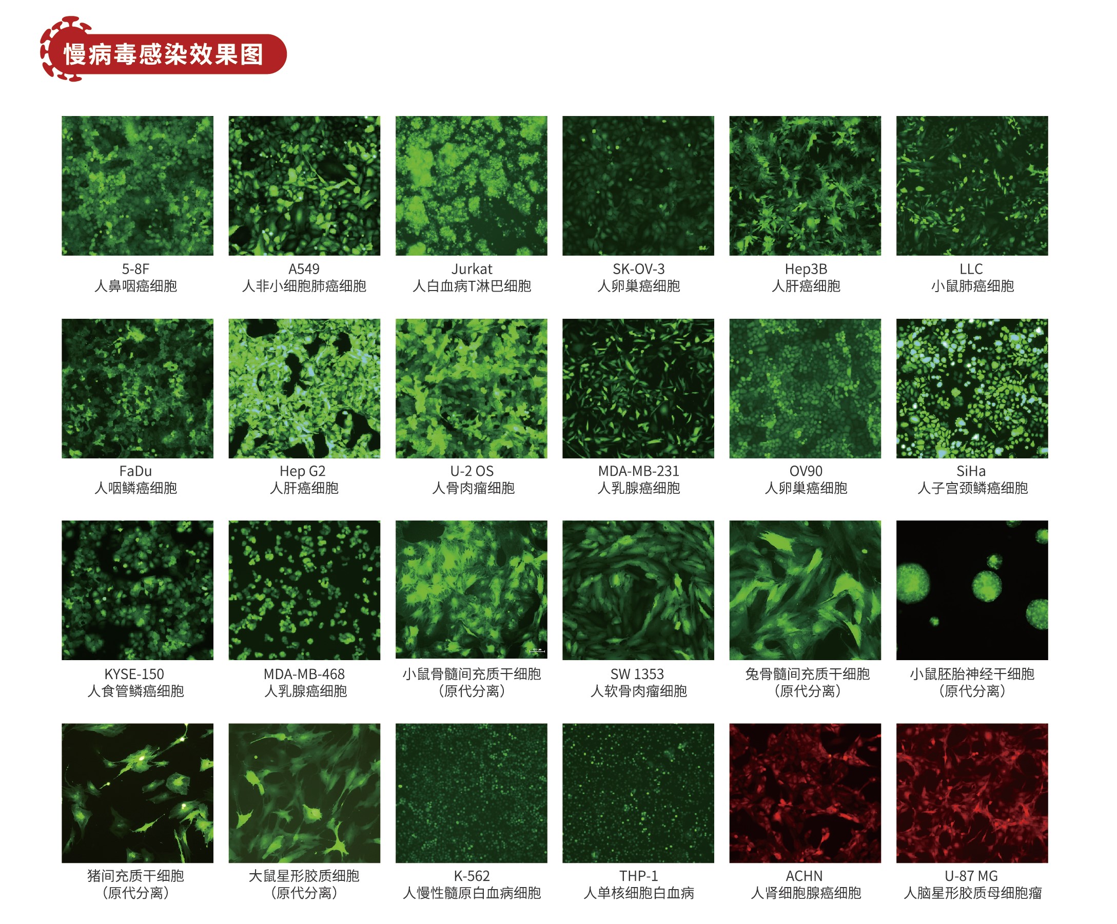 慢病毒能够有效地感染培养的肝细胞、心肌细胞、神经元、内皮细胞、干细胞等多种类型的细胞。