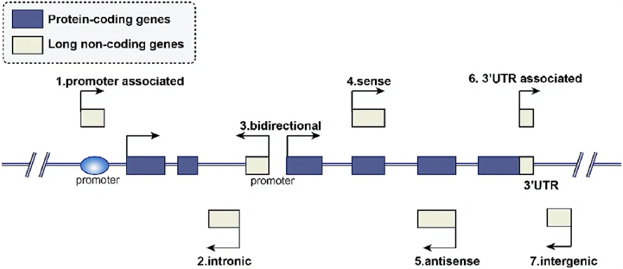 LncRNA根据其相对位置在调控靶编码基因中发挥重要作用,根据其在基因组上与编码基因相对位置的不同,可以将lncRNA分为以下几类(见图1):1.启动子区(来自启动子区域的转录本);2.内含子间(主要产生于编码基因的内含子区);3.双向(与蛋白质编码基因共享相同的启动子,但转录方向相反);4.正义链(转录方向与蛋白质编码基因方向相同,存在于同一编码基因正义链,具有重叠的外显子);5.反义链(转录方向与蛋白质编码基因方向相反,存在于反义链,至少有一个外显子重叠);6.3’UTR区(来自3’UTR区域的转录本);7.基因间(来自于两个蛋白质编码基因之间的DNA序列)。与mRNA类似,lncRNA也可以存在于细胞核或细胞质中,但主要位于细胞核。