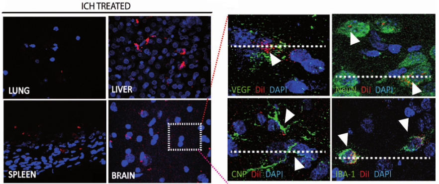 图七 DiI标记的外泌体通过静脉注射观察在体内器官的分布情况(Laura Otero-Ortega et al., J Cereb Blood Flow Metab. 2018)