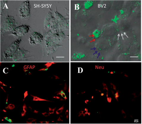 图八 用GFP标记的外泌体分别与SH-SY5Y、BV2和DRG细胞共培养(Rui Ren et al., Artif Cells Nanomed Biotechnol. 2019)