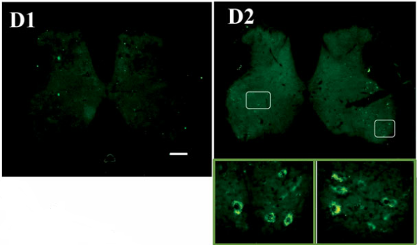 图九 注射有CD63-GFP的外泌体后观察第1天(D1)和第5天(D2)的荧光(Rui Ren et al., Artif Cells Nanomed Biotechnol. 2019)