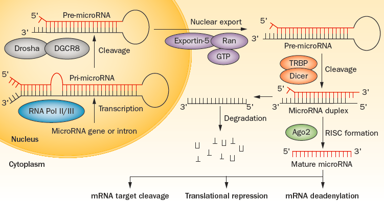 图一 miRNA成熟及作用方式(Mikhailidis DP, Athyros VG. Nat Rev Cardiol. 2014 Feb;11(2):72-4.)