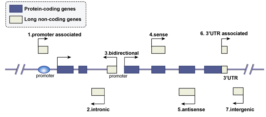 根据lncRNA在基因组上相对于蛋白编码基因的位置,可以将其分为启动子区(promoter associated)、内含子间(intronic)、双向(bidirectional)、正义链(sense)、反义链(antisense)、3’UTR区(3’UTR associated)、基因间(intergenic)这7种类型。这种位置关系对于推测lncRNA的功能有很大帮助。