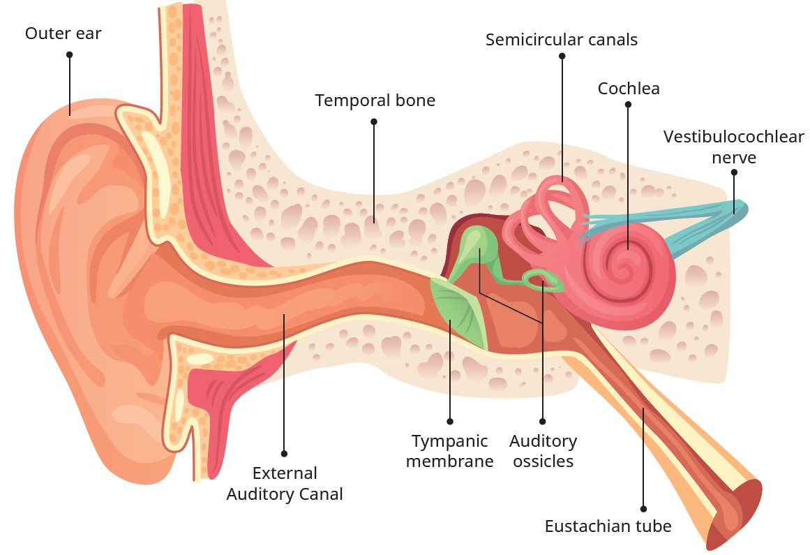 耳(Ear)是哺乳动物的听觉器官,也是识别方位维持身体平衡的器官,耳主要由外耳、中耳和内耳三部分组成。外耳负责声音搜集,中耳负责声音放大,内耳充满淋巴液,当接受中耳传来的声波撞击后,会造成淋巴液的流动,内耳中的毛细胞可把液体波动变换成神经信号,进而由内耳耳蜗神经传送至听觉中枢,最终实现听觉。