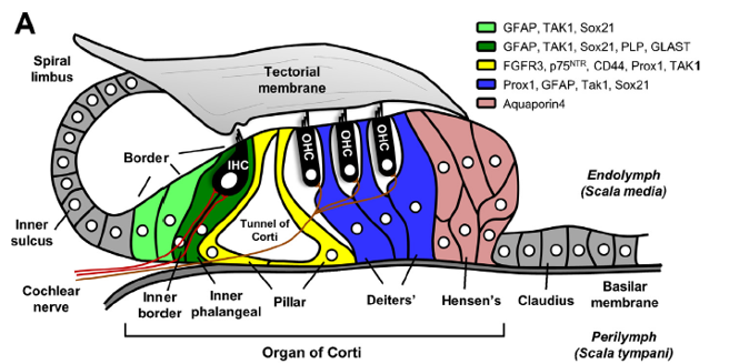 内耳包含三种主要功能细胞:毛细胞(Hair Cells, HCs)、支持细胞(Supporting Cells, SCs)和螺旋神经节(Spiral Ganglion Neurons, SGNs)。其中HCs又包括内毛细胞(Inner hair cells, IHCs)和外毛细胞(Outer hair cells, OHCs),OHCs负责将声音放大;IHCs负责将液体波动转化为电信号,并通过听觉神经传递到听觉脑干,再到听觉皮层。