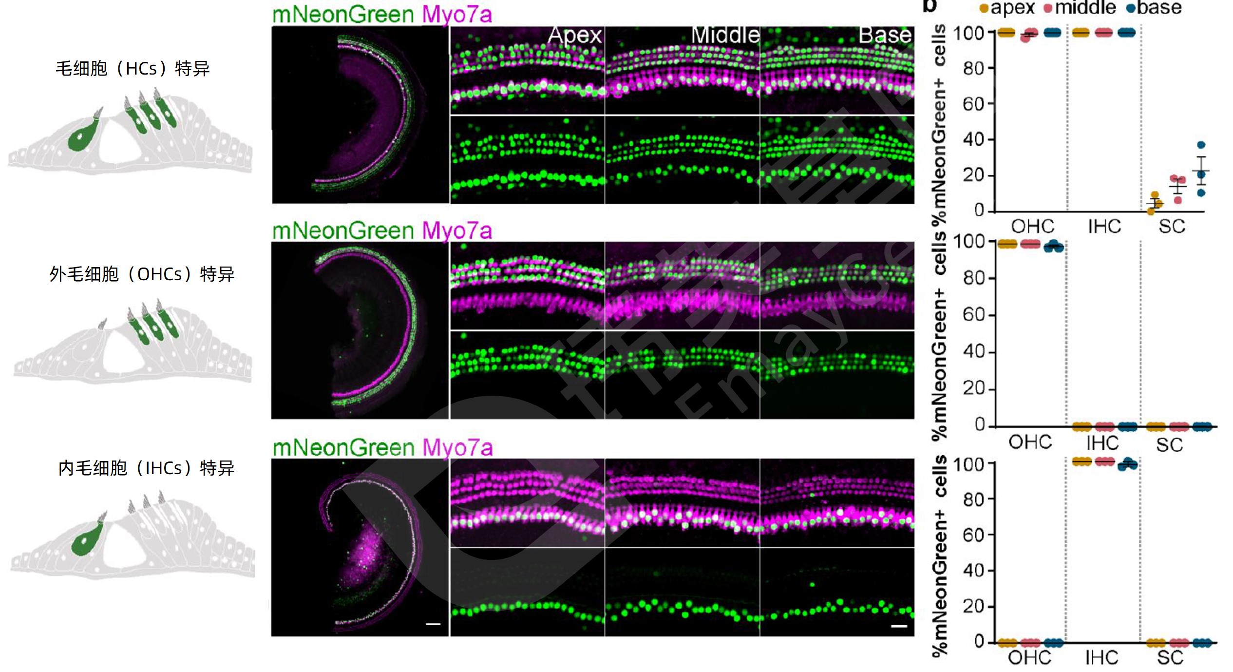 AAV-ie高效感染内耳各种细胞类型(图片来源:Prof. Guisheng Zhong)