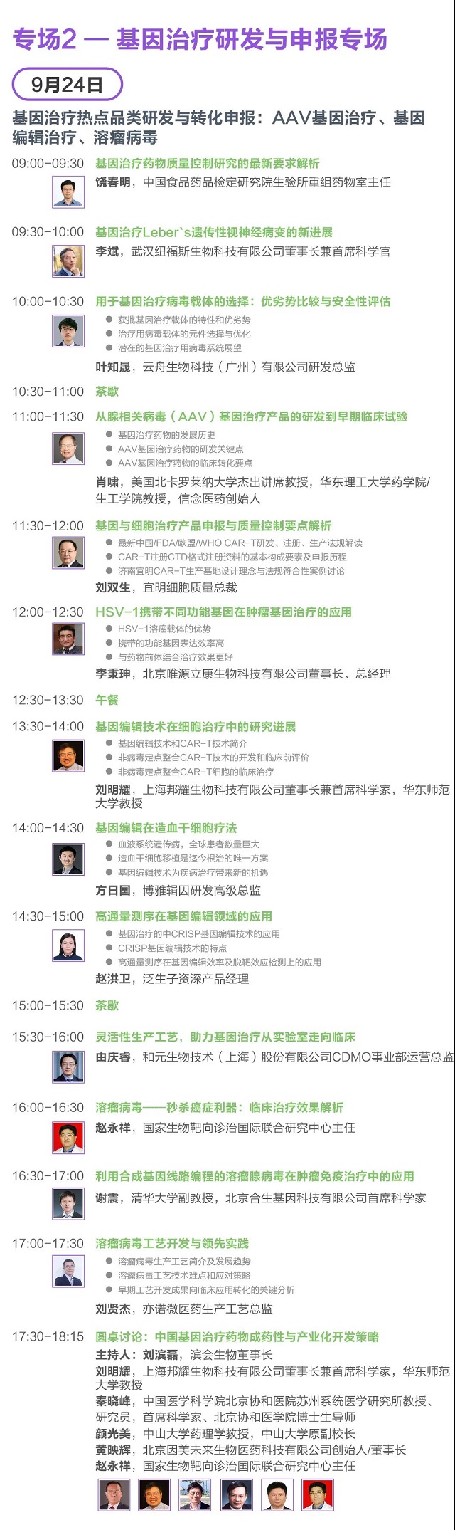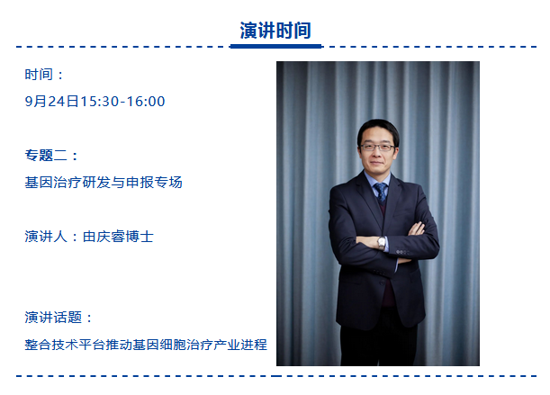 9月24日下午15:30-16:00在专题二-基因治疗研发与申报专场,我司CDMO事业部运营总监由庆睿博士,带来整合技术平台推动基因细胞治疗产业进程的主题演讲,届时欢迎大家前来讨论交流。
